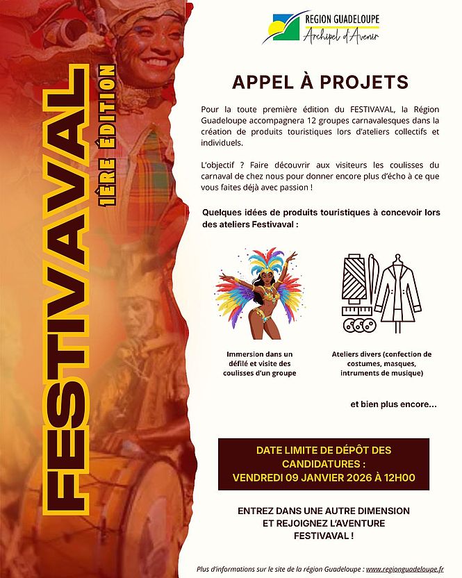 Dans le cadre de la 1ère édition du FESTIVAVAL, la Région Guadeloupe lance un appel à projets destiné à sélectionner 12 groupes de carnaval qui seront accompagnés dans la création et la mise en marché de produits touristiques innovants, en vue d’un lancement en 2026.
