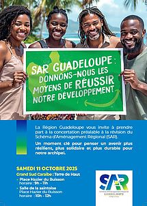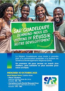 Tout l'agenda Ecoutez Révision du SAR - Concertation à La Désirade Le 18 octobre La Région Guadeloupe vous invite à prendre part à la concertation préalable à la révision du Schéma d’Aménagement Régional (SAR). Un moment clé pour penser un avenir plus résilient, plus solidaire et plus... Révision du SAR - Concertation à SAINT-ANNE Le 16 octobre La Région Guadeloupe vous invite à prendre part à la concertation préalable à la révision du Schéma d’Aménagement Régional (SAR). Un moment clé pour penser un avenir plus résilient, plus solidaire et plus... Révision du SAR - Concertation à SAINTE-ROSE Le 15 octobre La Région Guadeloupe vous invite à prendre part à la concertation préalable à la révision du Schéma d’Aménagement Régional (SAR). Un moment clé pour penser un avenir plus résilient, plus solidaire et plus... Révision du SAR - Concertation à TERRE DE HAUT Le 11 octobre La Région Guadeloupe vous invite à prendre part à la concertation préalable à la révision du Schéma d’Aménagement Régional (SAR). Un moment clé pour penser un avenir plus résilient, plus solidaire et plus... Révision du SAR - Concertation à TERRE DE BAS Le 11 octobre La Région Guadeloupe vous invite à prendre part à la concertation préalable à la révision du Schéma d’Aménagement Régional (SAR). Un moment clé pour penser un avenir plus résilient, plus solidaire et plus... Lancement de la 3ème édition de l’Appel à Projet « Un éco-projet pour ma Guadeloupe » Le 13 septembre La Région Guadeloupe présente, en partenariat avec la DEAL, l’ADEME, l’Office de l’Eau, et le Conseil Départemental, l’Appel à projets "Un éco-projet pour ma Guadeloupe". Dépôt de dossier : APPEL A PROJETS "Un Écoprojet pour ma Guadeloupe" Du 13 septembre au 17 octobre Face aux enjeux environnementaux croissants en Guadeloupe, territoire riche d'une biodiversité exceptionnelle mais confronté à de multiples pressions écologiques, l'éducation à l'environnement et au... [SAVE THE DATE] évènement de réseau rural : "LA TRANSITION, GRANDEUR NATURE" Le 12 septembre Le conseil régional de Guadeloupe vous invite à l'évènement de son réseau rural : "LA TRANSITION, GRANDEUR NATURE" Lancement de la 3ème édition du village régional de l'économie circulaire Le 29 août La Région Guadeloupe vous invite au séminaire de lancement de l'appel à candidature pour la 3ème édition du Village régional de l'économie circulaire le vendredi 29 août à 17H à l'espace régional du Raizet au... 3ème village de l'Economie Circulaire : appel à candidatures restaurateurs Du 29 août au 29 septembre Résolument déterminée à impulser un modèle économique innovant et durable basé sur l’économie circulaire au sein de notre archipel, la Région Guadeloupe, en partenariat avec l’ADEME et l’Union Européenne dans... Page 1 de 10. 1 2 3 .... 10 Suivant