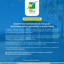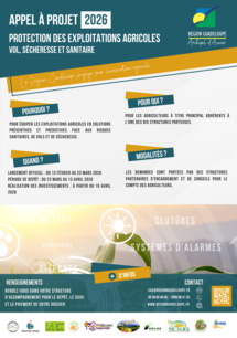 Appels à projet Ecoutez Appel A Projet : Protection des Exploitations 2026 Du 13 février au 13 avril 2026 La collectivité régionale lance un appel à projet pour l’équipement des petites exploitations agricoles en solutions préventives et prédictives face à la multiplicité des risques agricoles. Occupation temporaire de kiosques – Boulevard Gerty Archimède à Basse-Terre Du 13 février au 06 mars 2026 La Région Guadeloupe informe le public de la publication d’un avis de publicité, suite à une manifestation d’intérêt spontanée, concernant l’occupation temporaire de deux kiosques situés sur le boulevard Gerty... APPEL PUBLIC À CANDIDATURES : OCCUPATION, MISE EN GESTION, ET VALORISATION DE L’HABITATION LA GRIVELIÈRE – VIEUX-HABITANTS Le 21 janvier 2026 La Région Guadeloupe lance un appel public à candidatures pour l’occupation et l’exploitation de l’habitation La Grivelière, située à Vieux-Habitants, au lieu-dit Grande Rivière. Ce site patrimonial... Appel à projets — 1ère édition du FESTIVAVAL ! Le 23 décembre 2025 Dans le cadre de la 1ère édition du FESTIVAVAL, la Région Guadeloupe lance un appel à projets destiné à sélectionner 12 groupes de carnaval qui seront accompagnés dans la création et la mise en marché de... IMPLANTATION DE DISTRIBUTEURS AUTOMATIQUES SUR LES SITES DE LA REGION GUADELOUPE Le 17 juillet 2024 En application de l’article L. 2122-1-1 du code général de la propriété des personnes publiques (CGPPP), la Région Guadeloupe organise une procédure de sélection préalable à la délivrance d’une autorisation... Un Écoprojet pour ma Guadeloupe Le 15 septembre 2025 Face aux enjeux environnementaux croissants en Guadeloupe, territoire riche d'une biodiversité exceptionnelle mais confronté à de multiples pressions écologiques, l'éducation à l'environnement et au... 3ème village de l'Economie Circulaire : appel à candidatures exposants Le 01 septembre 2025 Résolument déterminée à impulser un modèle économique innovant et durable basé sur l’économie circulaire au sein de notre archipel, la Région Guadeloupe, en partenariat avec l’ADEME et l’Union Européenne dans... 3ème village de l'Economie Circulaire : appel à candidatures restaurateurs Le 01 septembre 2025 Résolument déterminée à impulser un modèle économique innovant et durable basé sur l’économie circulaire au sein de notre archipel, la Région Guadeloupe, en partenariat avec l’ADEME et l’Union Européenne dans... APPEL A PROJETS : PROTECTION DES EXPLOITATIONS AGRICOLES Le 01 octobre 2024 Dans le cadre du SRDEII et au regard du contexte agricole, la région Guadeloupe lance un appel à projet pour la "protection des exploitations agricoles" [CANDIDATURE CONCOURS] Majò an maké kréyòl - Concours de nouvelles, de contes et de poèmes en créole guadeloupéen Du 01 octobre au 20 janvier 2025 Dans le cadre de la défense et de la promotion de la langue créole, le Conseil de la Culture, de l’Education et de l’Environnement (CCEE) Guadeloupe organise un concours de nouvelles, contes et de poésies en... Page 1 de 3. 1 2 3 Suivant